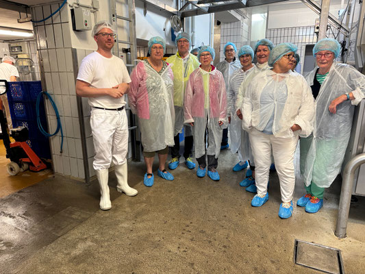 Eine Betriebsführung durch die Produktionsräume der Molkerei Grafschaft Hoya in Asendorf stand -gekoppelt mit einer Radtour-für die LandFrauen und LandHerren des Bezirks 2 im Juli auf der Agenda. Bevor der Rundgang startete, schlüpften die 11 Gäste in Einmalkittel, Kopfhauben und Überschuhe. Herr Müller, einer der 40 Mitarbeitenden der Molkerei, erläuterte die unterschiedlichen Arbeitsabläufe, vor allem die Schritte, die auch heute noch manuell erledigt werden.
