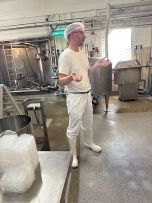 Bereits morgens um 3:00 Uhr sei Arbeitsbeginn, sodass die frischen Produkte ab 7:00 Uhr die Produktion verlassen könnten, erläuterte Müller. Während der Führung war bereits Arbeitsende und die Produktions stand still. Die Milch, im Jahr immerhin 75 Millionen Liter, würde jeden zweiten Tag von den 48 Erzeugern direkt vom Hof abgeholt, so Müller. Die Produktpalette bestehe aus Milch, Sahne, verschiedene Sorten Butter, unterschiedliche Joghurtsorten, Buttermilch, Zitronenbuttermilch, Schichtkäse und Sahneschichtkäse. Besonders letzterer sei in der Region sehr beliebt.